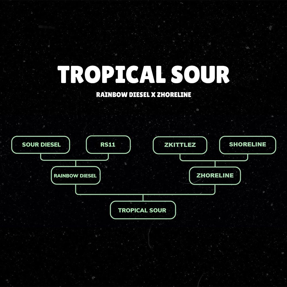 Tropical Sour Grounded Genetics is the gassy, sour diesel tinged hybrid from the new Zhoreline line. Tropical Sour is a special hybrid that utilises the Rainbow Diesel for the mother's side, which itself is a crossing of Sour Diesel (RiRi Cut) pollinated by the workhorse that is the RS11, a tried-and-tested reversal used for several elite Grounded Genetics hybrids. On the reversal side is the Zhoreline (Zkittlez x Shoreline) adding her truly special terps into the mix.